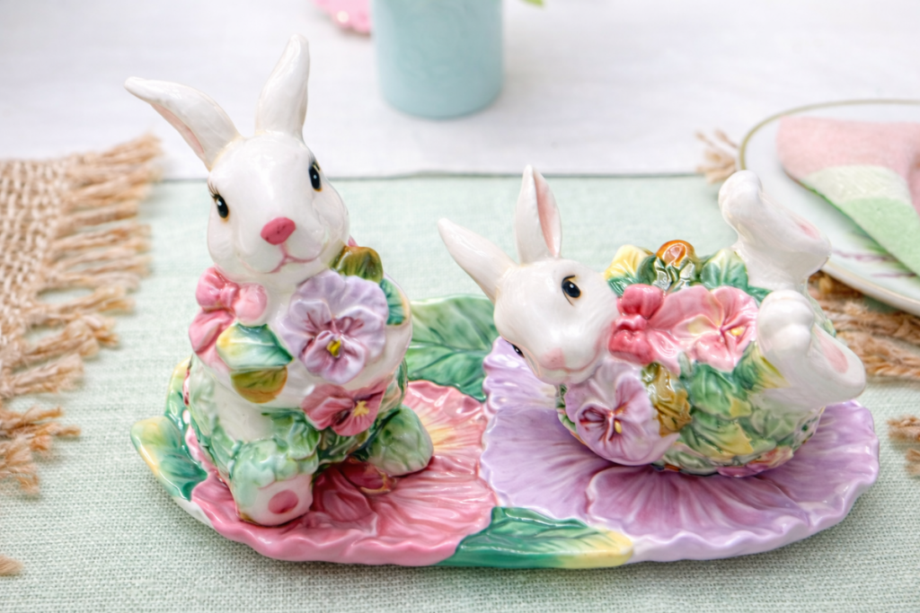 One of my favorite parts of this table was using what I already had around the house. The bunny figurines became the stars of the setup. They added personality right away and made the table feel playful without being too overwhelming.